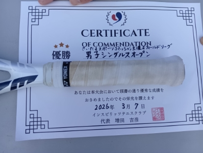 2026.03.06 03/06(金) 増田吉彦出場!男子シングルス オープン 優勝<インスピリッツテニスクラブ> 増田吉彦さん、優勝おめでとうございます(^O^) 【優勝者コメント】 試合の中で皆さんと会話が出来た気がして嬉しいです! 拍手12