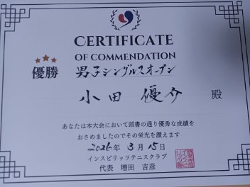 2026.03.15 03/15(日) 川越水上公園主催 男子シングルス オープン 優勝<川越水上公園> 小田優介さん、優勝おめでとうございます(^O^) 【優勝者コメント】 たくさん回り込みました。 ありがとうございました。 拍手1