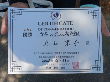 2026.04.11 女子シングルス テニスハレ大宮 04/11(土) 女子シングルス 初中級 優勝<テニスハレ大宮> 丸山京子さん、優勝おめでとうございます(^O^) 【優勝者コメント】 メンタルの良い練習になりました。中級頑張ります。 拍手2