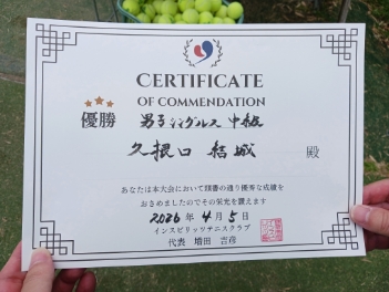 2026.04.05 男子シングルス インスピリッツテニスクラブ 04/05(日)男子シングルス 中級 優勝<インスピリッツテニスクラブ> 久根口結城さん、優勝おめでとうございます(^O^) 【優勝者コメント】 ありがとうございました! 次は中上級で頑張ります! 拍手3