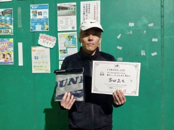 2025.01.01 男子シングルス トマトインドアテニスクラブ 01/01(水) 男子シングルス 中級賞品付 優勝<トマトインドアテニスクラブ> 中村良和さん、優勝おめでとうございます(^O^) 【優勝者コメント】 元旦から良いことがあって嬉しいです! 今年も良いことがありますように。 拍手12