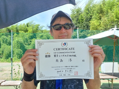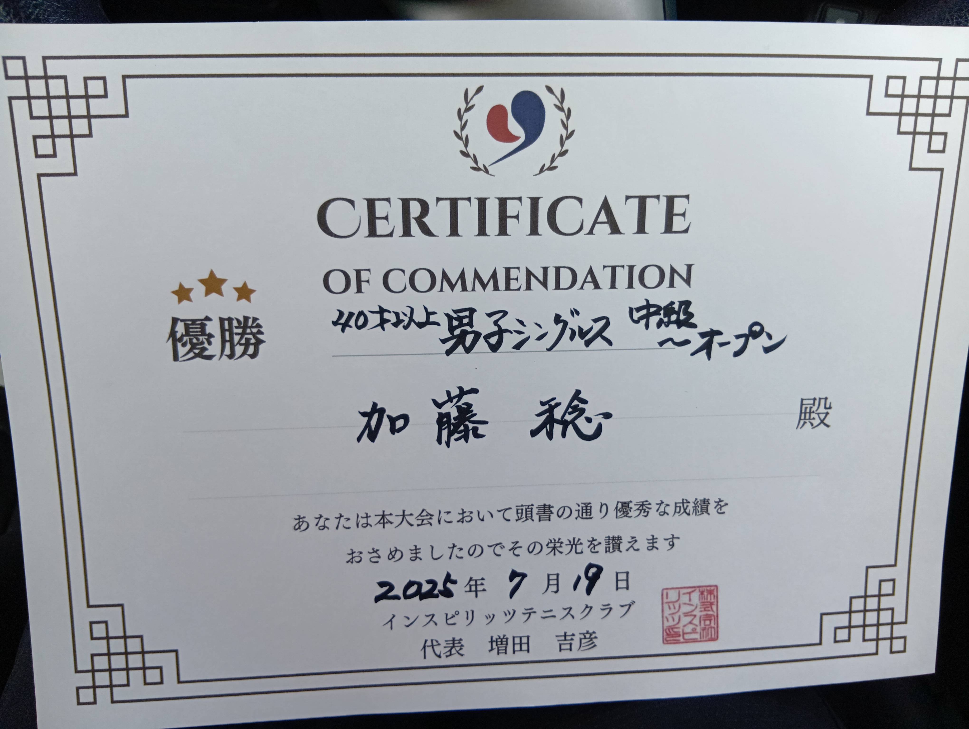 2025.07.19 男子シングルス 大熊テニスクラブ 07/19(土) 40歳以上 男子シングルス 中級〜オープン 優勝<大熊テニスクラブ> 加藤稔さん、優勝おめでとうございます(^O^) 【優勝者コメント】 楽しかったです 拍手5