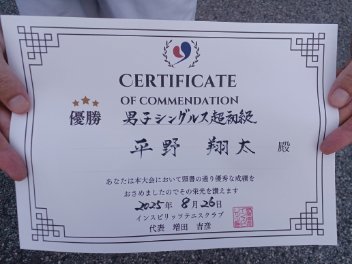 2025.08.26 男子シングルス トマトインドアテニスクラブ 08/26(火) 男子シングルス 超初級 優勝<トマトインドアテニスクラブ> 平野翔太さん、優勝おめでとうございます(^O^) 【優勝者コメント】 ありがとうございました!! 拍手2