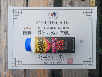 2026.01.21 男子シングルス トマトインドアテニスクラブ 01/21(水)男子シングルス 初中級 優勝<トマトインドアテニスクラブ> 増田剛之さん、優勝おめでとうございます(^O^) 【優勝者コメント】 精進します! 拍手2