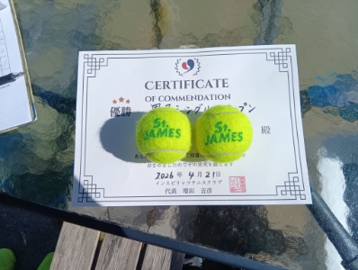 2026.04.16 男子シングルス トマトインドアテニスクラブ 04/16(木) 宮澤盛男(モーリー)出場! 男子シングルス オープン 優勝<トマトインドアテニスクラブ> じゃがいも太郎さん、優勝おめでとうございます(^O^) 【優勝者コメント】 上手く集中することができました。運も良かったです。 みなさん、ありがとうございました。 拍手8