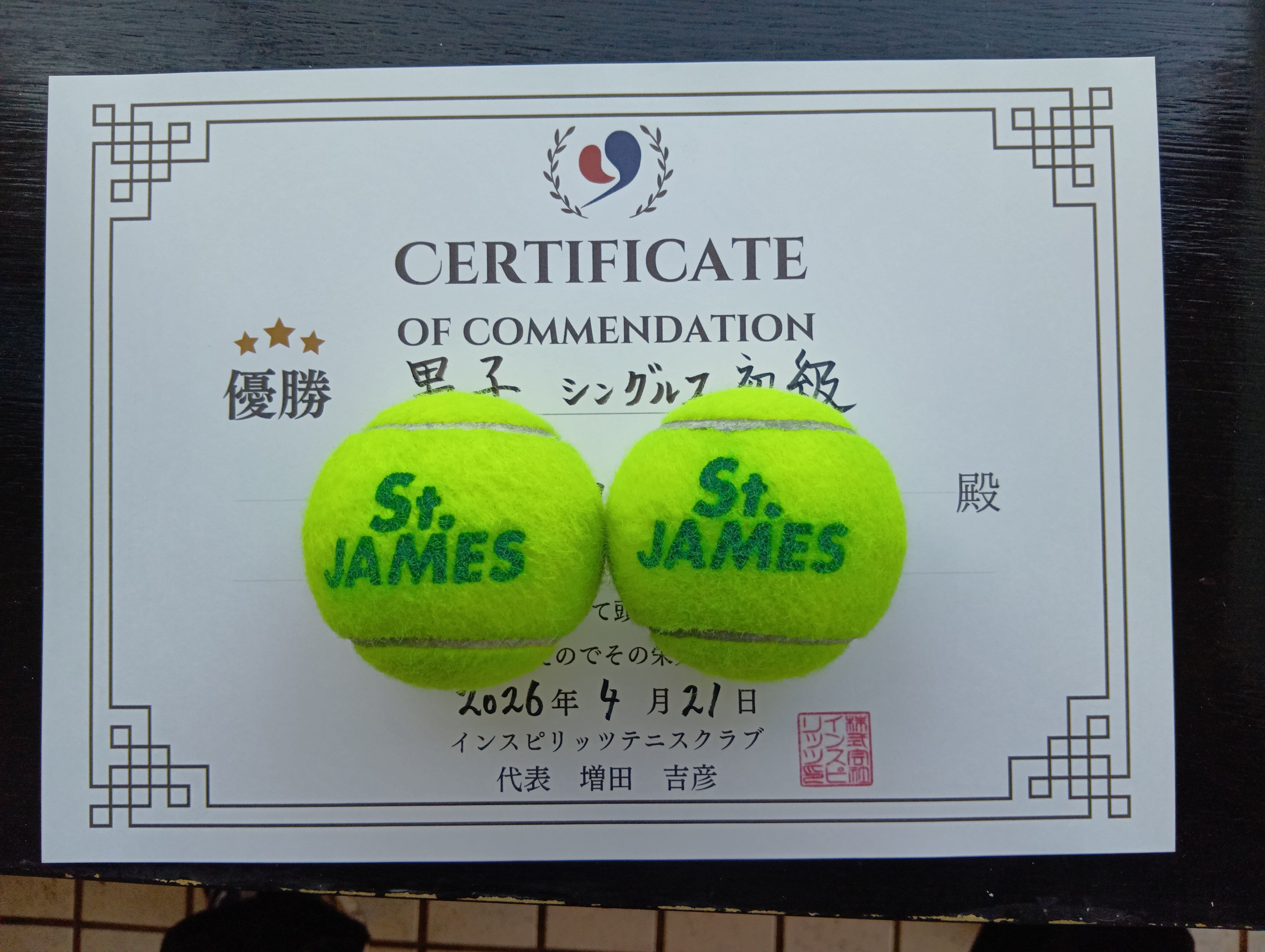 2026.04.17 男子シングルス トマトインドアテニスクラブ 04/17(金) 男子シングルス 初級 優勝<トマトインドアテニスクラブ> スズキケントさん、優勝おめでとうございます(^O^) 【優勝者コメント】 石原コーチと田中コーチのおかげです! ナガイさんとナガタさんが焼肉をごちそうしてくれるのを楽しみにしていみす! 拍手6
