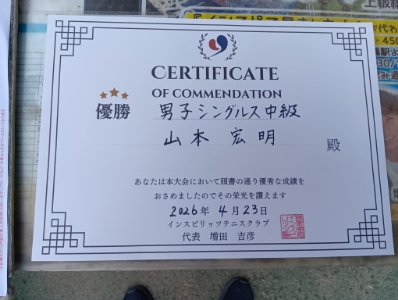 2026.04.18 男子シングルス 大熊テニスクラブ 04/18(土) 男子シングルス 中上級 優勝<大熊テニスクラブ> 横山雅克さん、優勝おめでとうございます(^O^) 【優勝者コメント】 今度はオープンでガンバります! 拍手4