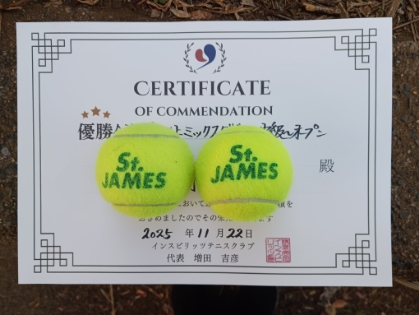 2025.11.23 ミックスダブルス インスピリッツテニスクラブ 11/23(日) ミックスダブルス オープン 優勝<インスピリッツテニスクラブ> ドラえもんさん、ドラミちゃんさん、優勝おめでとうございます(^O^) 【優勝者コメント】 駐車場、大変でしたね、、、小原さんお疲れさまでした! 拍手4