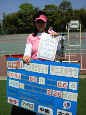 2010.05.29 女子シングルス 05/29(土) 女子シングルス 中級 優勝<富士見市運動公園> 滝田香奈江さん優勝おめでとうございます。 【優勝者コメント】 今日は振り抜くことを意識しました! 拍手0