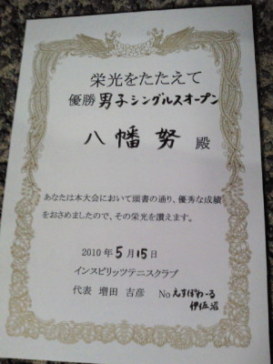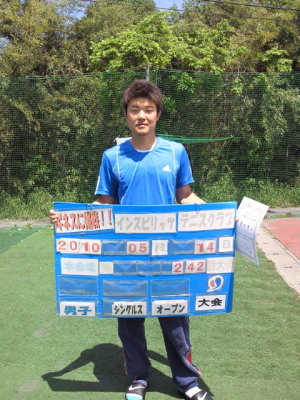2010.05.15 男子シングルス 05/15(土) 男子シングルス オープン 優勝<富士見市運動公園> 岩崎啓介さん、優勝おめでとうございます! 【優勝者コメント】 上級で勝てるよう頑張ります!! 拍手0