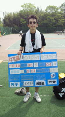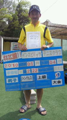 2010.05.04 男子シングルス インスピリッツテニスクラブ 05/04(火) 男子シングルス 超初級 優勝<インスピリッツテニスクラブ> 石原正さん優勝おめでとうございます。 【優勝者コメント】 佐藤君やったぜ! 拍手0