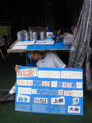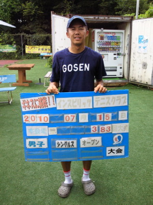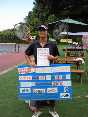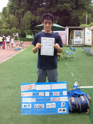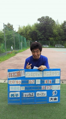 2010.07.11 男子シングルス 大宮運動場 07/11(日) 男子シングルス オープン 優勝<大宮運動場> 斉藤陽吾さん、優勝おめでとうございます(^O^) 【優勝者コメント】 暑かったです! 拍手0