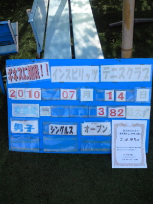 2010.07.11 男子シングルス インスピリッツテニスクラブ 07/11(日) 男子シングルス オープン 優勝<インスピリッツテニスクラブ> 難波亮介さん優勝おめでとうございます。 【優勝者コメント】 チームのみんなのお陰です。 素振り万歳\(^O^)/ 拍手0