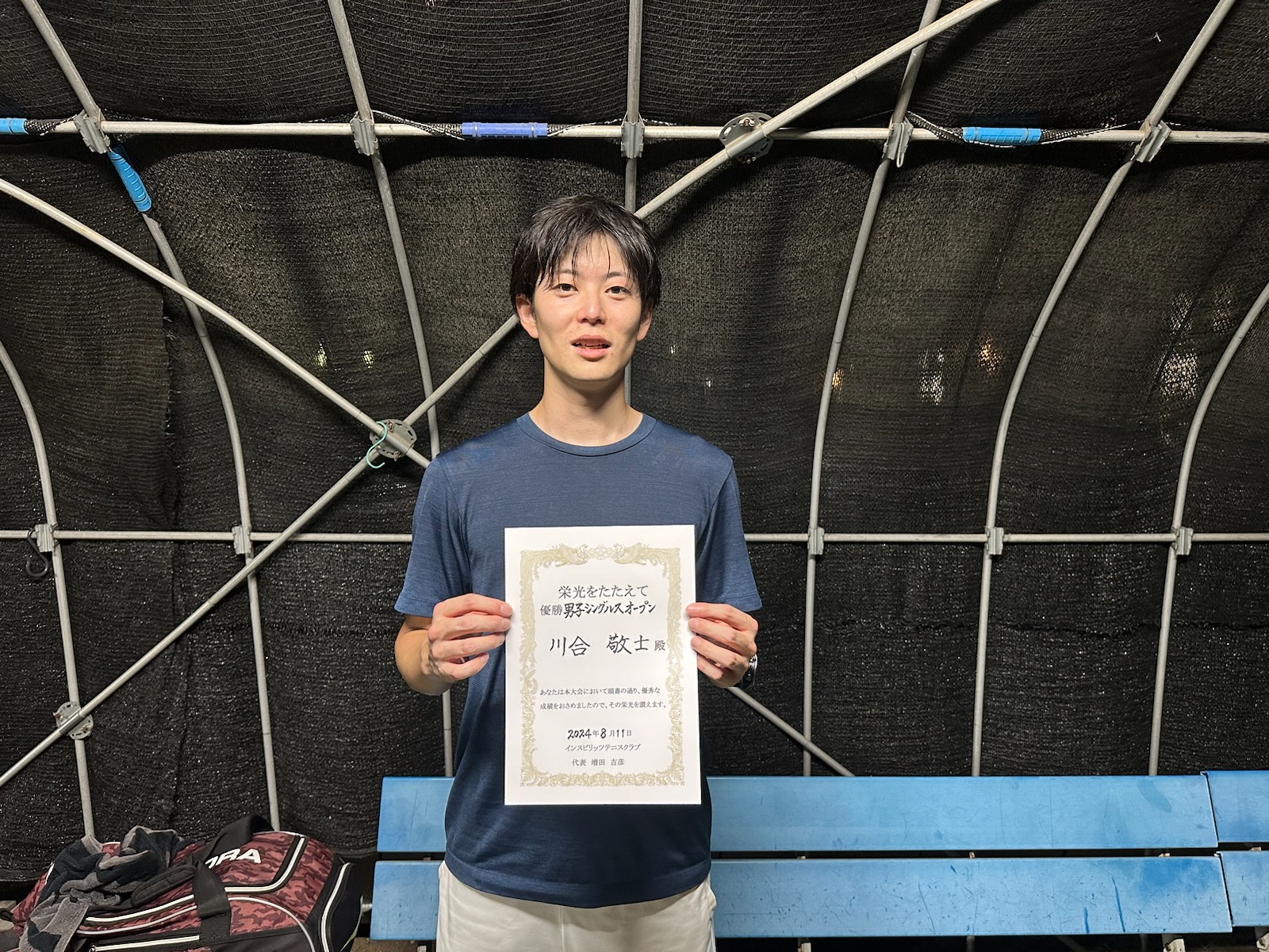 2024.08.11 男子シングルス 桶川グリーンテニスクラブ 08/11(日) 男子シングルス オープン 優勝<桶川グリーンテニスクラブ> 川合敬士さん、優勝おめでとうございます(^O^) 【優勝者コメント】 暑かった! 対戦者の皆さまありがとうございました。 拍手6