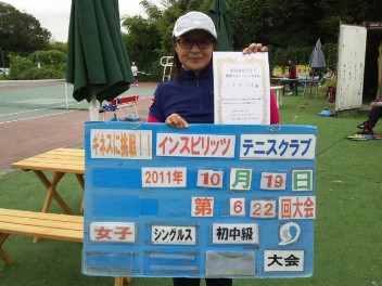 2011.10.21 女子シングルス 東大宮テニスクラブ 10/20(木) 女子シングルス 超初級 優勝<東大宮テニスクラブ> 海山有理さん、優勝おめでとうございます(^O^)【優勝者コメント】めちゃくちゃ嬉しいです♪運が良かったです。 拍手0
