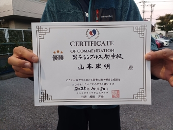 2025.10.30 男子シングルス トマトインドアテニスクラブ 10/30(木) 男子シングルス 初中級 優勝<トマトインドアテニスクラブ> 山本宏明さん、優勝おめでとうございます(^O^) 【優勝者コメント】 対戦して下さった皆様ありがとうございました! 拍手4