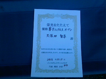 2018.11.03 男子シングルス トマトインドアテニスクラブ 11/02(金) 男子シングルス オープン 優勝<トマトインドアテニスクラブ> 久保田智淳さん、優勝おめでとうございます(^O^)【優勝者コメント】フォアの精度をもっと上げたいです! 拍手0