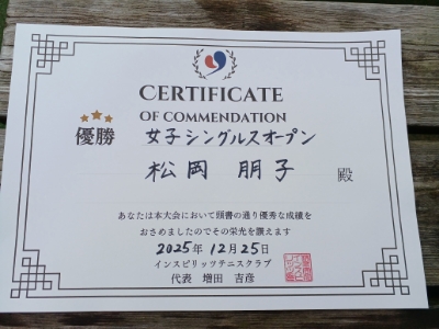 2025.12.25 女子シングルス インスピリッツテニスクラブ 12/25(木) 女子シングルス オープン 優勝<インスピリッツテニスクラブ> 松岡朋子さん、優勝おめでとうございます(^O^) 【優勝者コメント】 集中して出来ました!! 拍手6