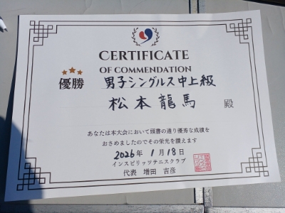 2026.01.18 01/18(日) 男子シングルス 初級 優勝<インスピリッツテニスクラブ> GILBERTさん、優勝おめでとうございます(^O^) 【優勝者コメント】 対戦していただいた方々、ありがとうございました。 拍手2