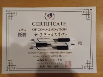 2026.01.12 ミックスダブルス 日本橋柏クラブ 01/12(月) ミックスダブルス 中級 優勝<日本橋柏クラブ> 宮崎澪さん、三輪哲也さん優勝おめでとうございます(^O^) 【優勝者コメント】 宮崎さん 「やりました!」 三輪さん 「4ヶ月頑張りました!」 拍手7
