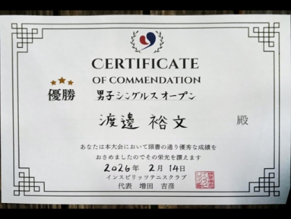 2026.02.14 男子シングルス ファンテニススクール八潮 02/14(土) 男子シングルス オープン 優勝<ファンテニススクール八潮> 渡邊裕文さん、優勝おめでとうございます(^O^) 【優勝者コメント】 ママさんの直前練習が効きました。 拍手6